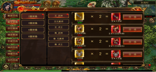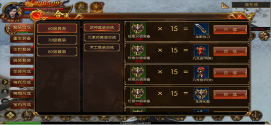 SET合成主要是让玩家在游戏初期使设备更简单,更过大。综合原理是用少量的低级设备(例如15级50级设备,以及合成一台60级设备的合成)合成上层设备。如下图所示: